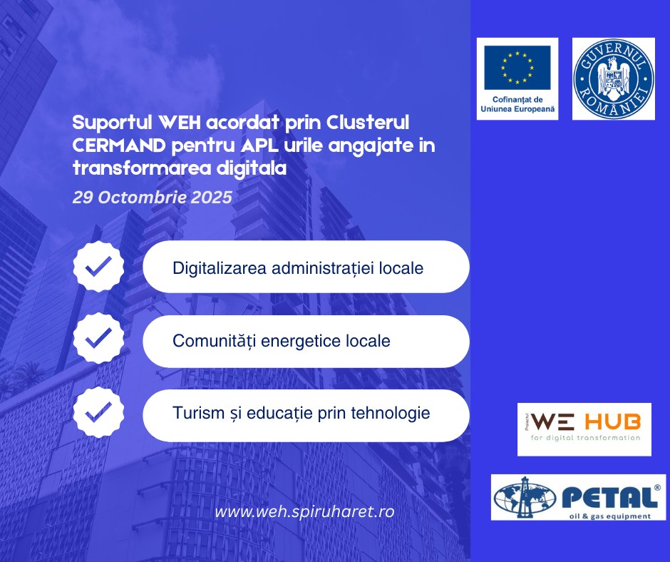 Miercuri, 29 octombrie 2025, între 14:30 și 18:30, la Universitatea Valahia din Târgoviște, are loc Workshop-ul WEH dedicat administrațiilor publice locale (APL) — un eveniment practic și colaborativ despre cum pot comunele să devină inteligente, energetice și sustenabile.